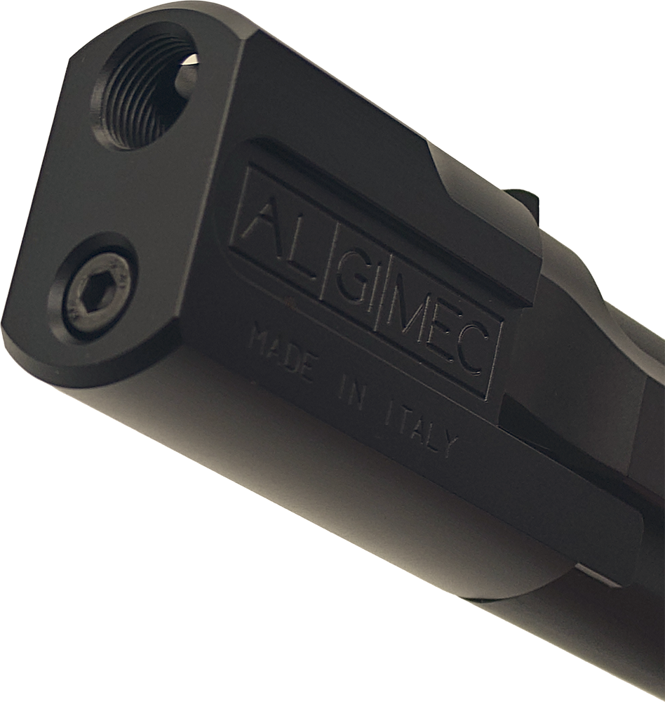 このモデルの顔とも言える大型コンペンセイターは、贅沢にもアルミ材の削り出しで製作しています。 劇中で登場するイタリアの希少なメーカーである「ALGIMEC」製の3 ポートタイプの大型コンペンセイターは、射撃時に発射ガスを上方へ逃がすことでマズルの跳ね上がりを劇的に減少させ、安定したラピッドファイア(連射)を可能にするカスタムパーツです。現在は生産終了しているコレクターアイテムでもあるこのイタリアンデザイン特有の複雑な形状を、モデルガン専用にエッジの効いたシャープな仕上がりで再現しました。